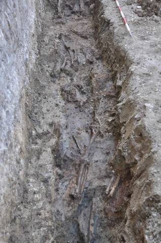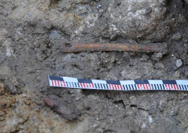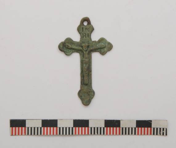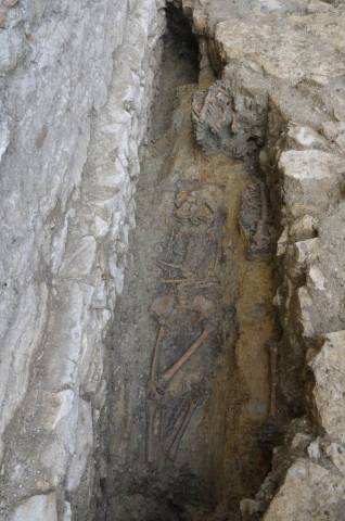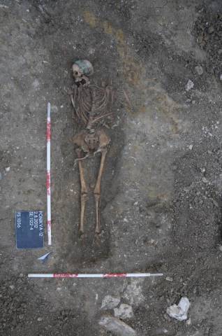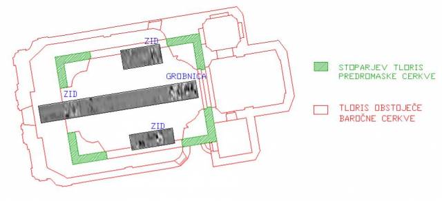 Ob cerkvi je bilo z 51-imi grobovi delno le dokumentirano, delno dokumentirano in izkopano veÄfazno skeletno grobišÄe. Jasno loÄljivi sta bili dve fazi grobišÄa, starejša in mlajša. Grobovi starejše faze so imeli dobro ohranjene lesene krste, pokojniki pa so bili pokopani brez pridatkov (slika 3). Grobovi mlajše faze krst veÄinoma niso imeli veÄ ohranjenih, o njihovem obstoju nam priÄajo zgolj železni žeblji. Za razliko od pokojnikov starejše faze, so bili pokojniki mlajše faze pokopani z razliÄnimi pridatki kot so rožni venci, svetinjice, križi, pasne spone, novci ipd. (slike 4 – 10). Zaradi odsotnosti Äasovno opredeljivih najdb starejše faze grobišÄa ni mogoÄe datirati. Mlajša faza grobišÄa je bila na podlagi pridatkov umešÄena v 18. stoletje.