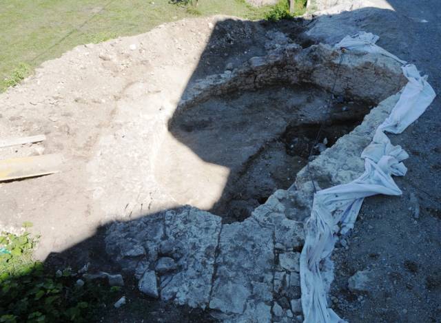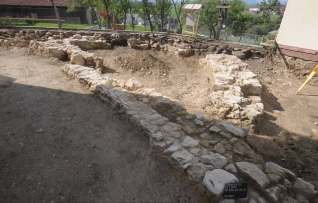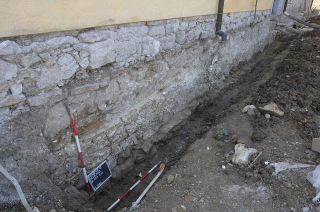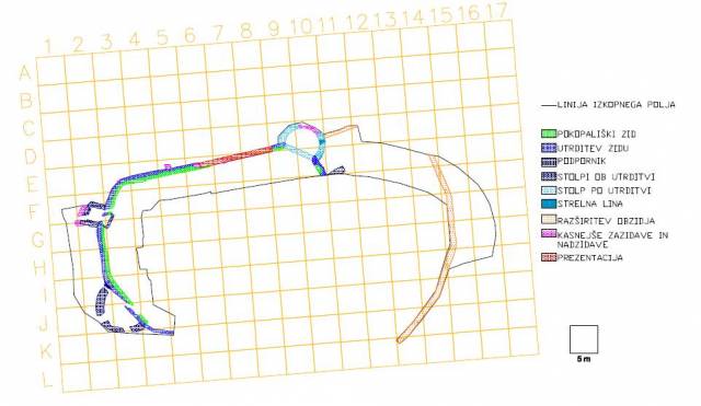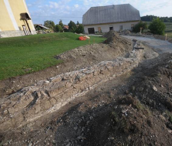 Okoli cerkve je bil odkrit pokopališki zid, utrjen s protiturškim obzidjem in stolpi. Glede na zgodovinske podatke je do utrditve prišlo po prvem pustošenju Turkov leta 1473 in pred vizitacijskim potovanjem Pavla Santonina v letih 1485 – 1487. Arheološko so bili raziskani trije stolpi, JZ polkrožni stolp s stranskim in glavnim vhodom ter odvodnim kanalom (slika 11, 12), SZ pravokotni stolp z utrjenim glinenim pragom (slika 13) ter SV polkrožni stolp s strelno lino, ki je bil v 18. stoletju preurejen v kostnico (slika 14 – 16). ÄŒetrti, JV stolp se je nahajal izven obmoÄja raziskav, najverjetneje pod današnjim župnišÄem. Kasneje v novoveškem Äasu je bil vzhodni del obzidja razširjen z dodatnim lokom (slika 17, 18). Gradnja razširitvenega loka tik ob zunanjem robu strelne line SV stolpa je lino razvrednotila, kar priÄa o razširitvi v Äasu po izgubi obrambne funkcije stolpa.